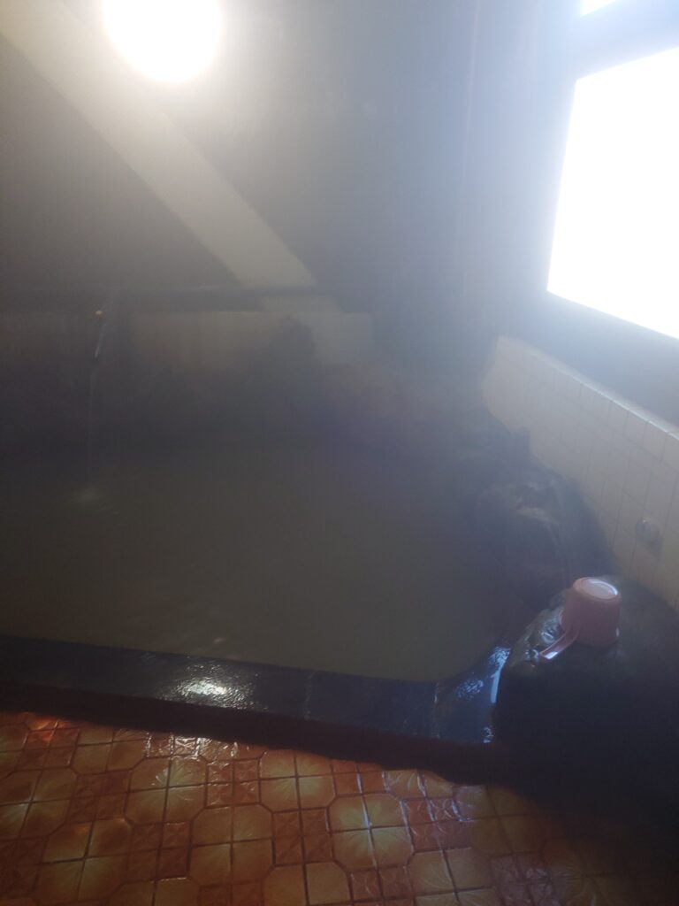 お姉さんが、温泉は透明だけど地下と直結してるから濁ってるよ、と丁寧に教えてくれました。舐めると、かなり塩っぱい。